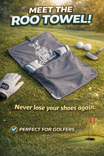 Unlike ordinary golf towels, Roo-Towel features a built-in kangaroo pouch that securely holds your golf shoes, gloves, or accessories. Simply wrap your shoes, clip the towel to your bag with the heavy-duty carabiner, and go — no more forgotten shoes, loose gear, or messy bags.