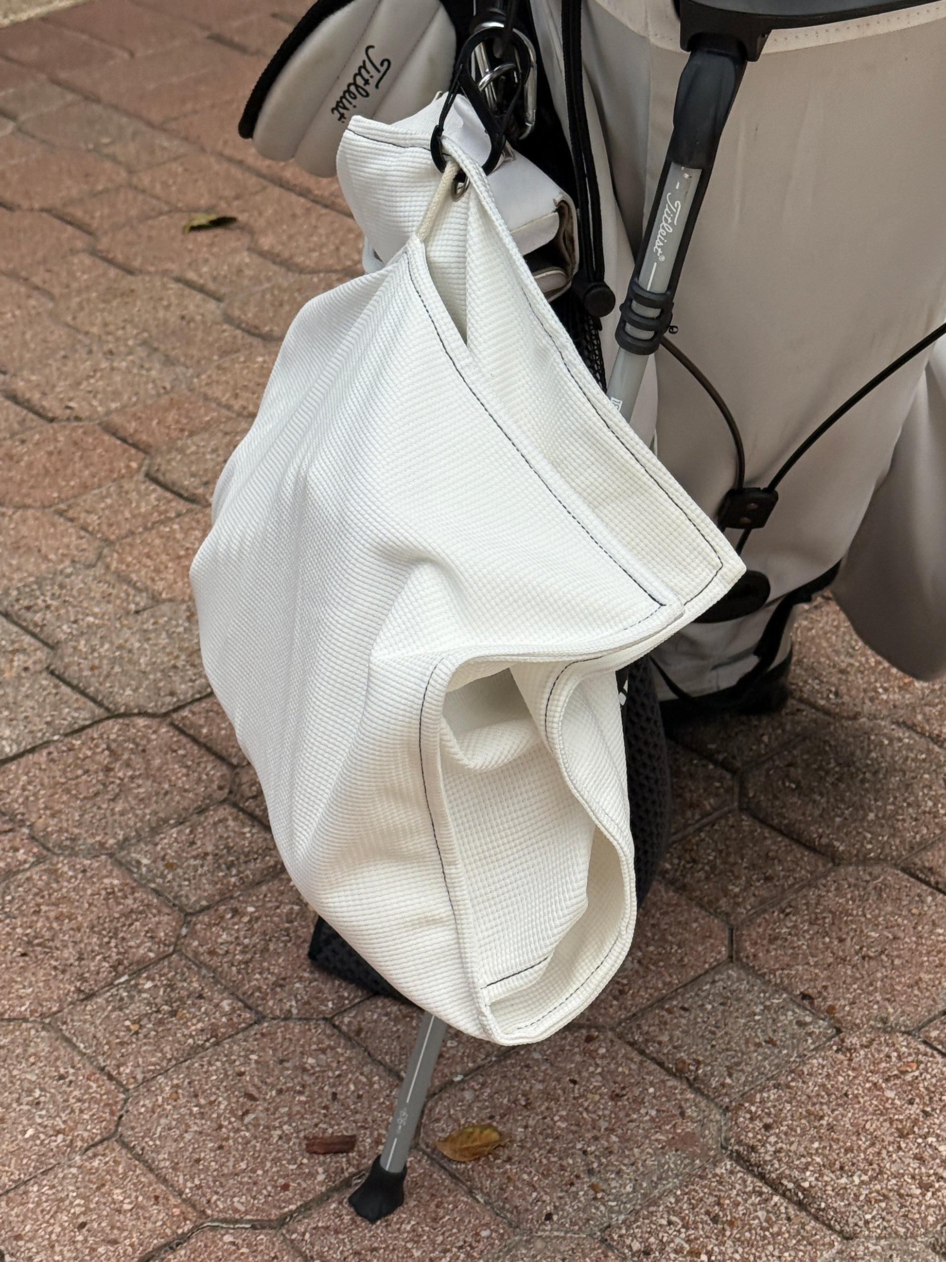 The string loop at the bottom of the towel securely holds your shoes, allowing you to carry them hands-free to and from the course.